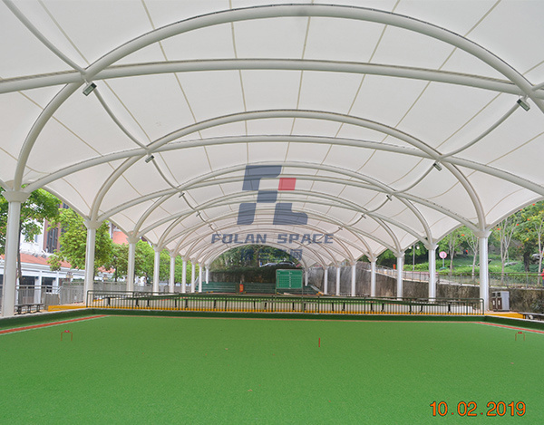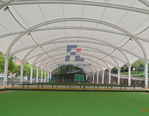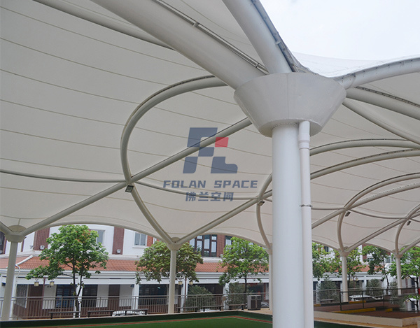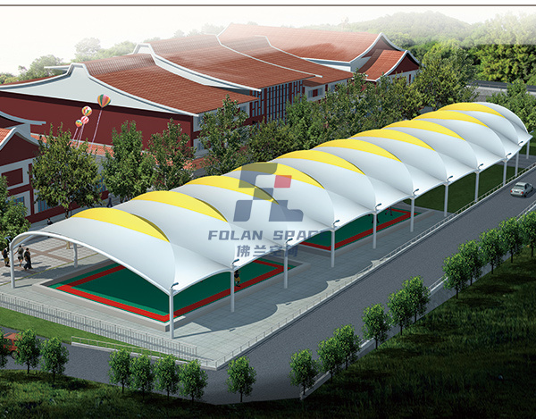 蓋頂材料選擇PVDF建筑膜材,這種材料具有透光、輕巧、抗風、自潔、安裝快、無污染等特點,建成后,不但可以遮陽擋雨,與公園旁邊的綠樹相襯,又可成為一道新的風景。
