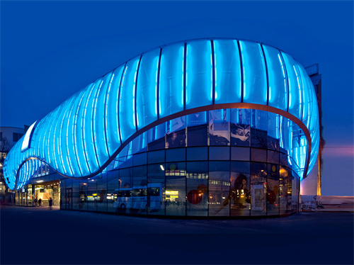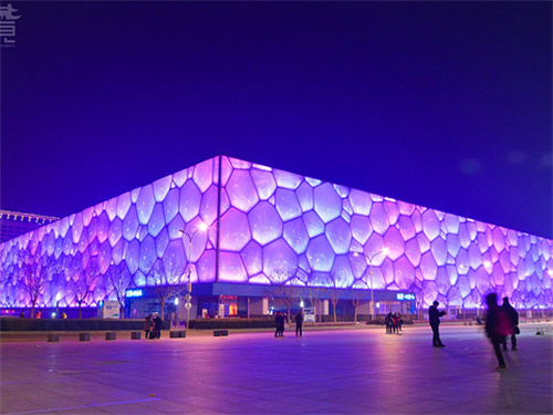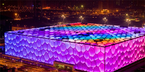 自內(nèi)向外的燈光映射,還常用在ETFE透明膜的建筑上,比如水立方,還有德國(guó)慕尼黑安聯(lián)球場(chǎng)。