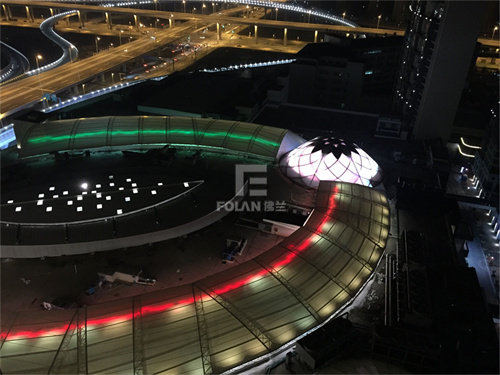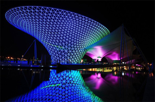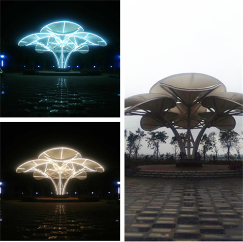 對(duì)于透射率低的膜材,其景觀照明往往選擇反射型,將燈光照射到膜材的外表面,利用膜布潔白平整的特點(diǎn),亦可營(yíng)造出不錯(cuò)的效果。
