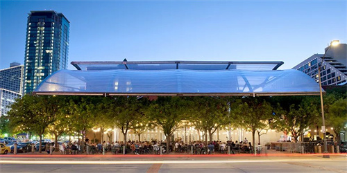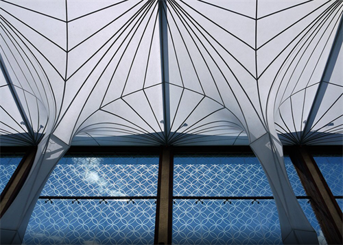 ETFE薄膜允許紫外線透射,可保證樹木健康生長,而在ETFE薄膜上印銀點就能為用餐者提供一定程度的陰影,最后結(jié)構(gòu)頂部的通風口可以讓暖空氣逸出,樹木和用餐者都會很舒適。該餐廳膜結(jié)構(gòu)形狀和跨度圍繞樹冠設(shè)計,ETFE材料的運用實現(xiàn)了人與自然的和諧相處。