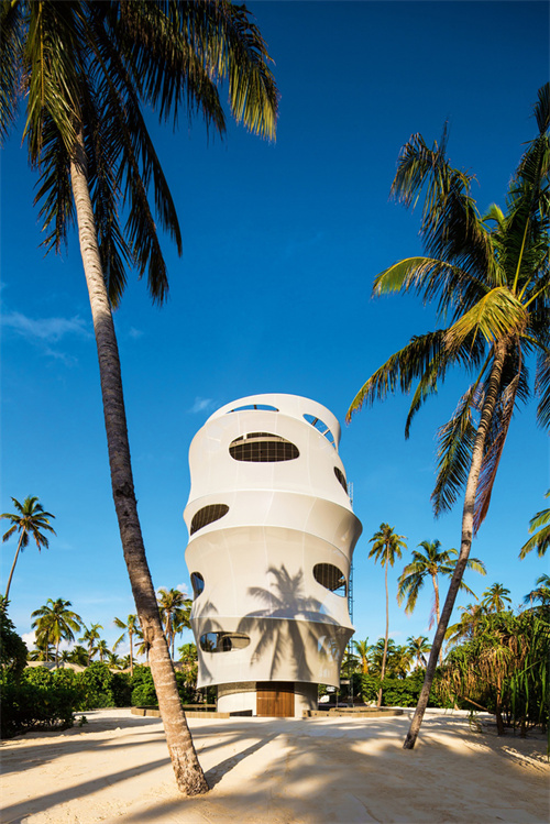 該獨特建筑位于馬爾代夫島,于2014年建成,和島上其他傳統(tǒng)建筑設(shè)計風格不同,該建筑采用了白色鏤空的膜結(jié)構(gòu)立面,使得建筑超前、現(xiàn)代。