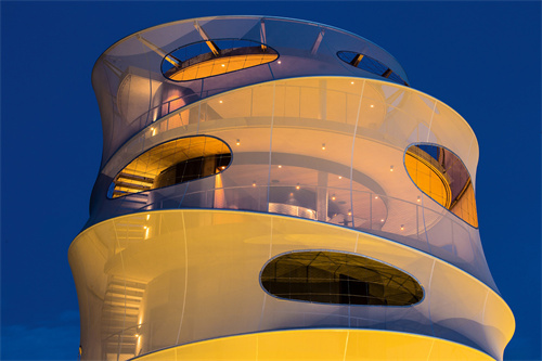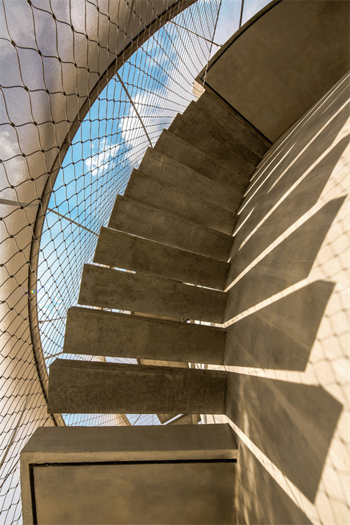 這座高23米造型獨特的餐廳足以吸引全島的目光。建筑使用鋼筋混凝土作為主要材料,金屬網(wǎng)和膜結(jié)構(gòu)作為建筑立面,垂直的桶狀構(gòu)造既是它的支撐結(jié)構(gòu)也是建筑的主體,外圍使用預(yù)制樓板制成的主樓梯盤旋而上。