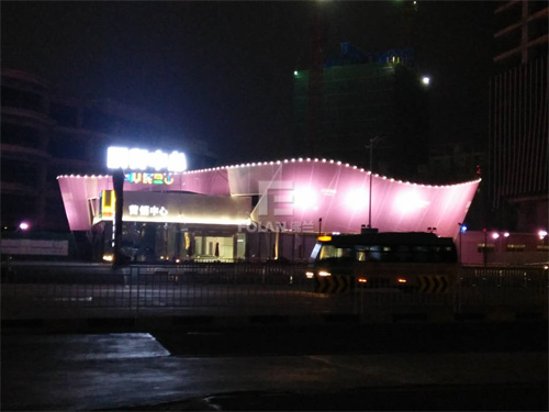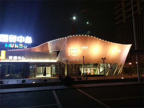 商業(yè)中心外立面使用膜結(jié)構(gòu),不僅造型獨(dú)特,曲線優(yōu)美,夜晚隨著燈光的變幻,整個(gè)建筑還五彩斑斕。佛蘭空間就曾在東莞建造過(guò)一個(gè)臨時(shí)國(guó)貿(mào)營(yíng)銷中心,其外立面采用骨架式結(jié)構(gòu)覆蓋網(wǎng)格膜,夜晚景觀十分壯美。