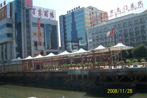 除了外立面和蓋頂,現(xiàn)在很多商業(yè)街都流行建造商業(yè)景觀,佛蘭空間就曾為東莞虎門百家商場(chǎng)建造吊帽形狀的長(zhǎng)廊,這些膜結(jié)構(gòu)涼亭不僅可供顧客停腳歇息,還能遮陽(yáng)避雨。