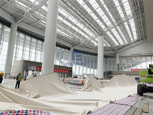 虎門高鐵站,建筑面積達26445平方米,佛蘭空間負責其高鐵站精裝修室內(nèi)吊頂工程,膜安裝面積約7000多平方米,施工方式采用多條長型PTFE軟膜逐步安裝,其中最長的一條約100米。