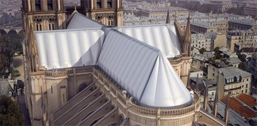 2019年,在巴黎圣母院屋頂線建筑競賽中,就有2個膜結(jié)構(gòu)建筑屋頂方案特別惹人眼球,膜結(jié)構(gòu)的運用,使得莊嚴(yán)肅穆的教堂增添了些許現(xiàn)代時尚感。