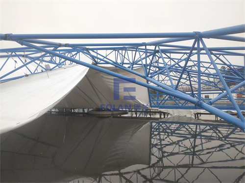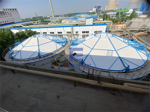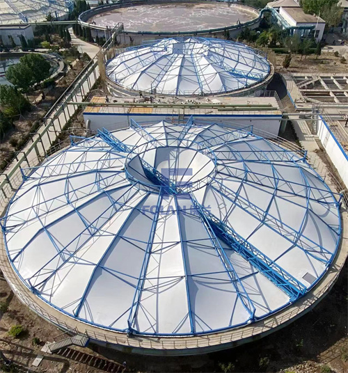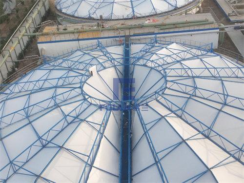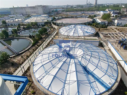 山東的4個污水池,采用鋼架式反吊膜加蓋方式,選用進口雙面PVDF抗酸堿、抗腐蝕膜材,以全新的技術實現(xiàn)鋼構反吊安裝。