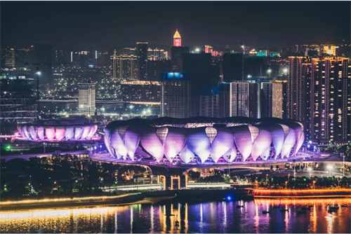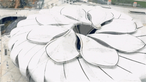 杭州奧體中心體育場屋頂由28片花瓣和27片小花瓣構(gòu)成,遠(yuǎn)看好似一朵綻放在錢塘江畔的“蓮花”,十分動(dòng)感飄逸。