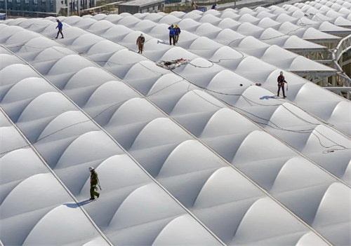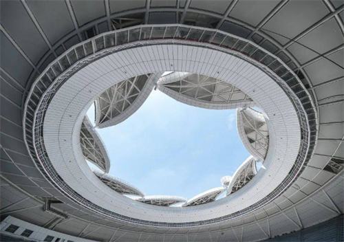 棒(壘)球體育文化中心設(shè)計(jì)中引人注目的則是球場上的云翼頂棚,既起到遮陽擋雨的作用,又展現(xiàn)出江南水鄉(xiāng)的地域特色。頂棚由雙向桁架系統(tǒng)支撐,覆蓋著涂有二氧化鈦的聚四氟乙烯(PTFE)薄膜,總面積達(dá)到2萬多平方米。表面呈現(xiàn)出微風(fēng)拂過水面泛起的漣漪效果,而在夜晚,LED燈光的照射下,天花板明亮通透,給觀眾帶來了一種獨(dú)特而舒適的觀賽體驗(yàn)。