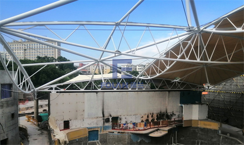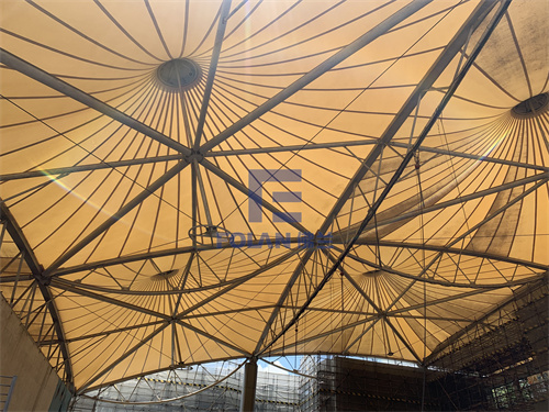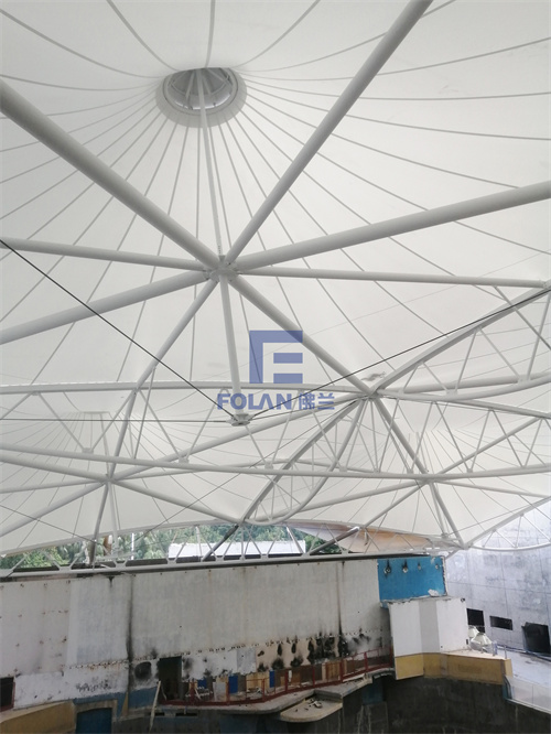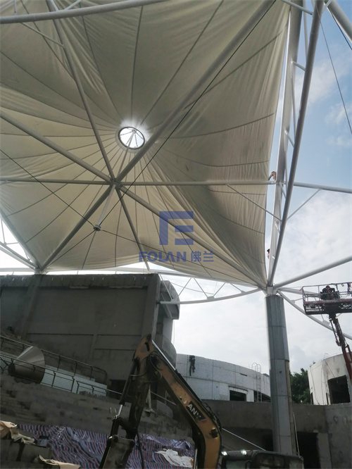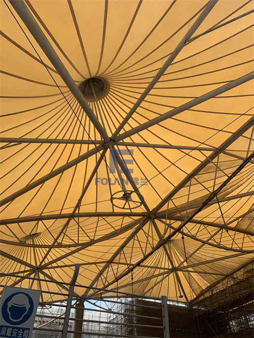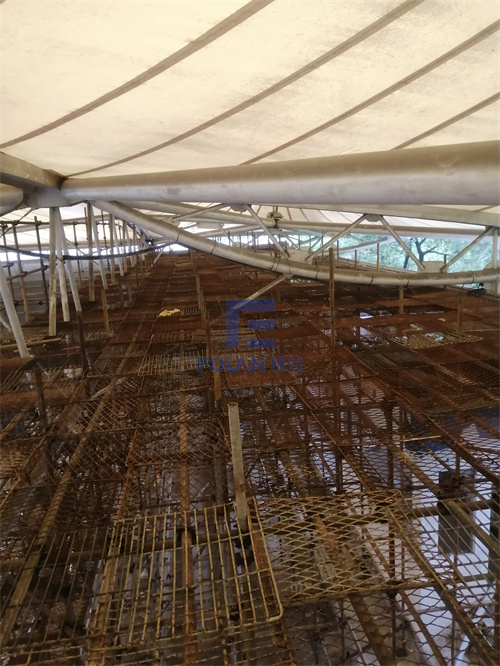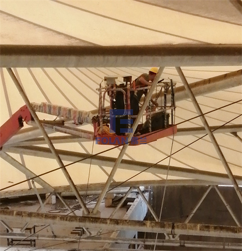 該項(xiàng)目面積約2400平方米,主要施工內(nèi)容包括原有舊鋼結(jié)構(gòu)的除銹翻新、舊膜拆除和新膜的制作、加工、安裝。