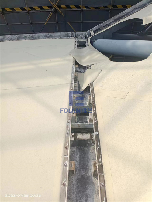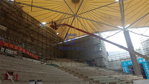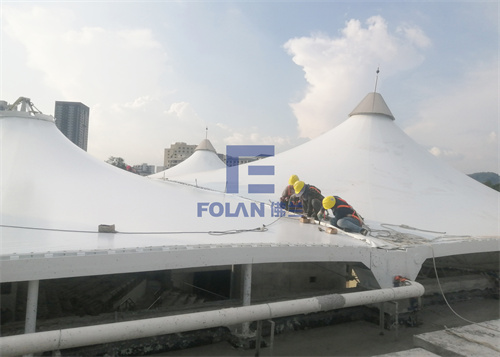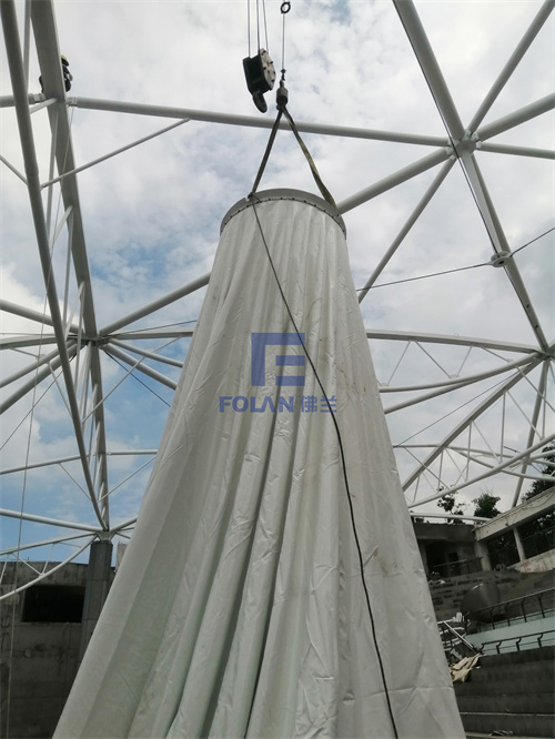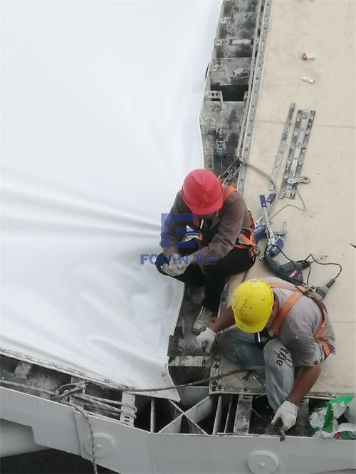 當(dāng)佛蘭空間項(xiàng)目施工人員將所有舊膜和零星固定桿件都已拆除,就要進(jìn)行新膜的吊裝、安裝及固定等施工步驟。該項(xiàng)目新膜材選用的是進(jìn)口法拉利1202S2高自潔PVDF膜,防霉防腐性能好,能長久保持其表面潔白美觀。