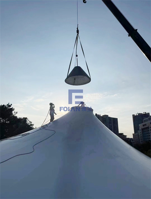 該項(xiàng)目造型獨(dú)特輕盈,由6個(gè)帽子和1段弧拱索邊拼接而成,在新膜的安裝過程中,施工人員先將裁剪好的帽型膜材進(jìn)行吊裝與安裝,然后再吊裝不銹鋼鋼帽,最后是帽子旁邊一段索邊弧拱膜材的吊裝與安裝。