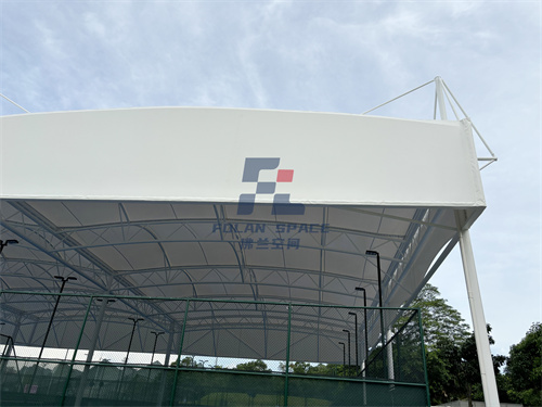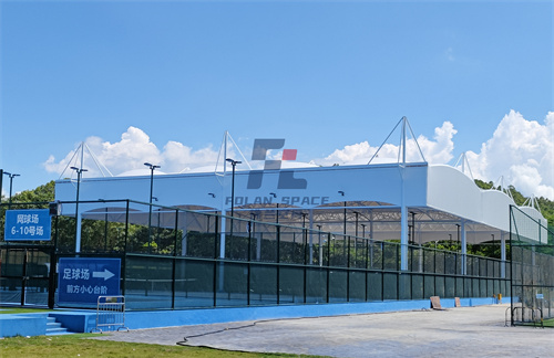 為更好地遮斜陽擋風(fēng)雨和凸顯膜結(jié)構(gòu)建筑的美觀性,佛蘭空間在球場側(cè)面設(shè)計時,特意在四周加了白色的立面膜材,可更好地防西曬和掃雨,充分發(fā)揮膜結(jié)構(gòu)建筑的優(yōu)勢。