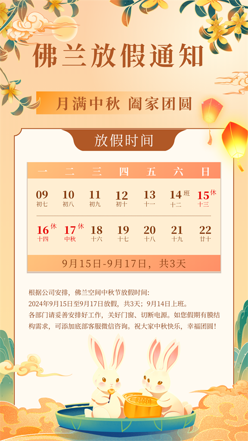 秋風(fēng)輕拂,桂香四溢,我們即將迎來一年一度的中秋佳節(jié)。在這溫馨而美好的時刻,佛蘭空間全體成員向您及您的家人致以最誠摯的節(jié)日祝福:中秋快樂,闔家團(tuán)圓!