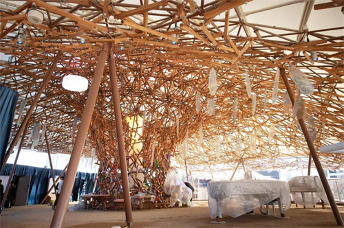 在“創(chuàng)造之樹”的內(nèi)部是藝術(shù)家長坂真護與中島制作人合作的垃圾藝術(shù)裝置“海月“,這是一個通過五感與互動裝置探索聲音與光線的體驗裝置,站立裝置正下方時,可聽到創(chuàng)作者二人的鋼琴聲從頭頂傾瀉。