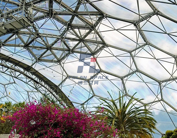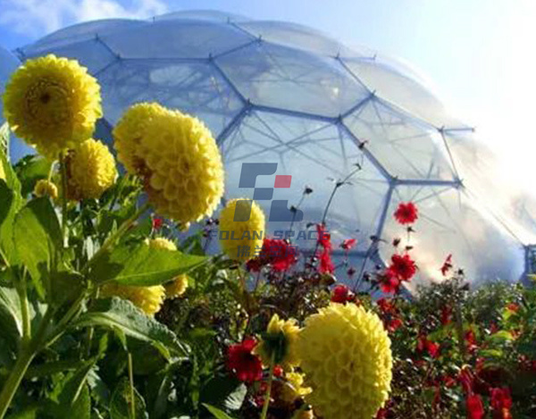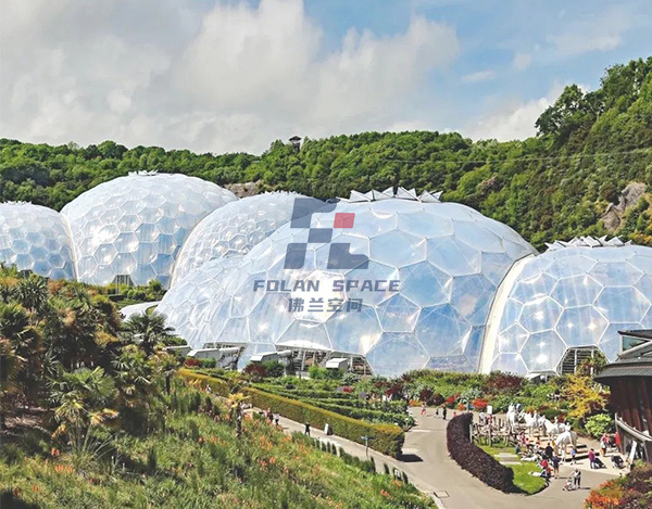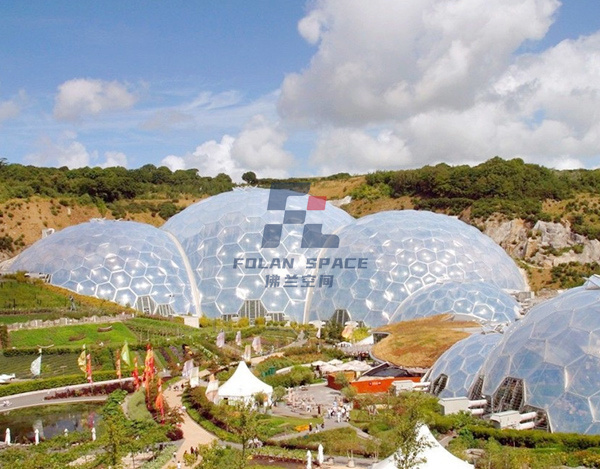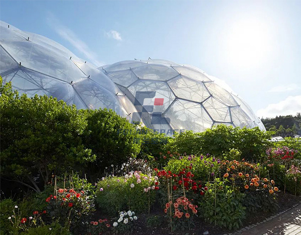 目前世界上大的植物園,為ETFE充氣膜結(jié)構(gòu)。整個建筑采用單層氣枕固定在主體鋼構(gòu)外側(cè),形狀多為六邊形。氣枕采用三層膜結(jié)構(gòu),外層厚度250μm,內(nèi)層膜厚度為200μm,中間厚度為50μm。