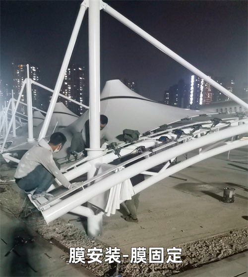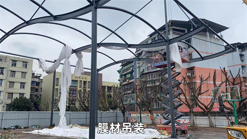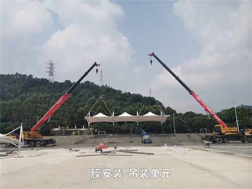 膜結(jié)構(gòu)的安裝施工方法通常有以下步驟:基礎(chǔ)準(zhǔn)備→支撐構(gòu)件(鋼結(jié)構(gòu))的制作、施工、安裝→膜材的制作、安裝與清洗。