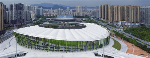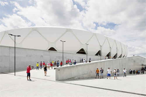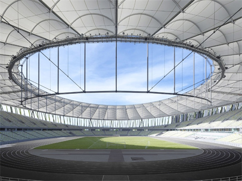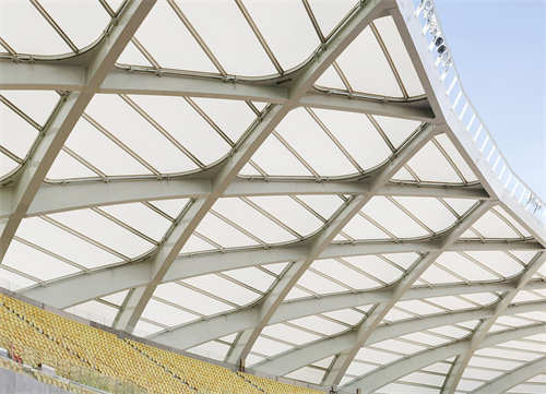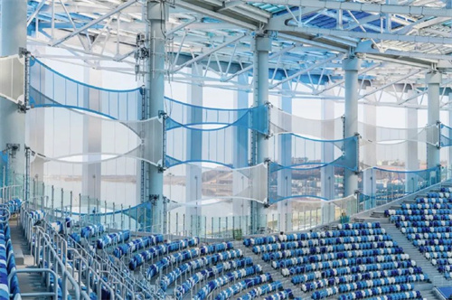 體育場(chǎng)頂棚是半開(kāi)放式的PTFE膜結(jié)構(gòu),純白的顏色和獨(dú)特的造型引人注目,頂棚可遮蓋所有的席位,使游客坐在席位上觀看比賽免受日曬雨淋。
