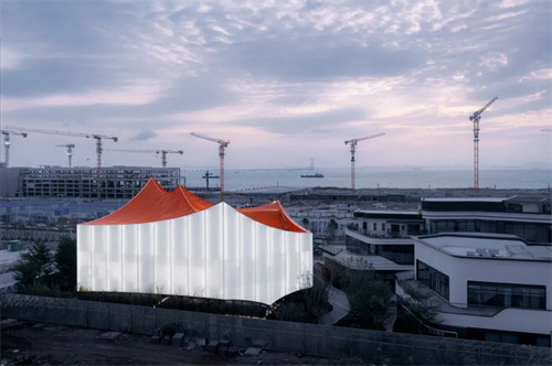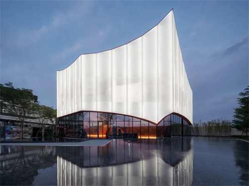 建筑師在這個項目中選用了28%和50%不同開孔率的PTFE網(wǎng)格膜材來達到半透明的效果,呈現(xiàn)一種欲語還休的親和力。
