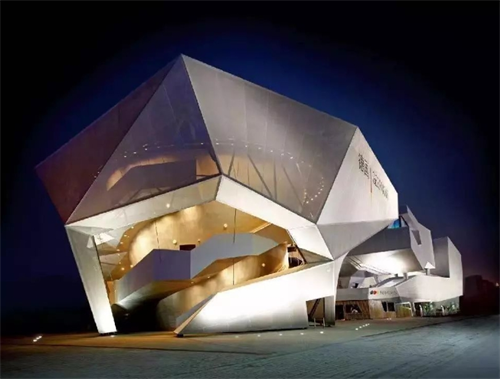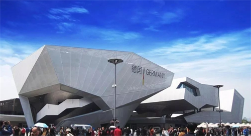 德國館外立面運用的是法拉利View381,材料柔軟,金屬銀涂層和28%的開孔率,能起到很好的遮陽和隔熱效果。在燈光的映襯下,德國館彰顯朦朧美和金屬質(zhì)感,整體輕盈、飄逸。