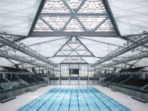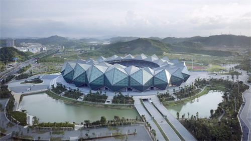 深圳大運會體育中心,外觀類似“鉆石”,結(jié)構(gòu)外層采用陽光板及玻璃幕墻,內(nèi)層使用透光率高、吸音性強、自潔性好的PTFE網(wǎng)格內(nèi)膜,面積超過10萬平方米。