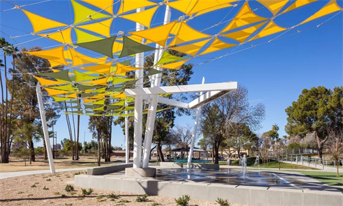 公園噴泉小廣場,是孩童玩耍嬉戲之地。噴泉頂部使用Soltis Perform92網(wǎng)孔遮陽織物做張拉帆結(jié)構(gòu)。View381網(wǎng)格膜開孔度為4%,具有很好的遮陽透氣功效。Soltis92織物織就的明黃,明綠及暗綠的三角遮陽帆層層疊疊,在自然光及夜景燈光下非常好看。