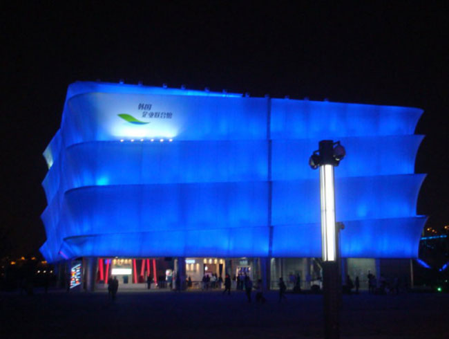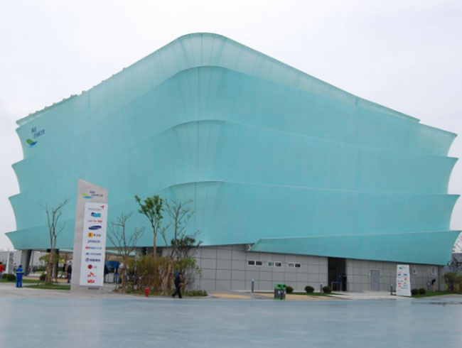 以我們都很熟悉的上海世博會幾個場館為例,展廳主體采用舊廠房或廢棄集裝箱改造,外觀則通過鋼架包裹膜結構完成整體施工,既節(jié)約了工期,又一改廢舊廠房古板、沉悶的外觀造型。如下圖,就是幾個世博園里的展館: