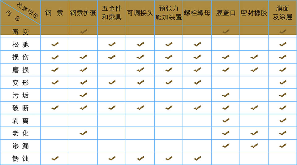 主要檢查項目有:膜材有無較大變形,膜材是否因預(yù)張力損失而松弛,膜材是否局部撕裂,膜材涂層是否剝離,拉索是否松動,油漆是否剝落等。