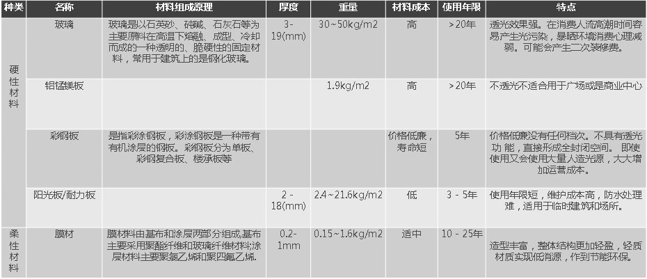 現(xiàn)將建筑市場(chǎng)常用蓋頂材料與膜結(jié)構(gòu)蓋頂特點(diǎn)一一介紹如下: