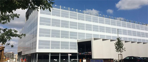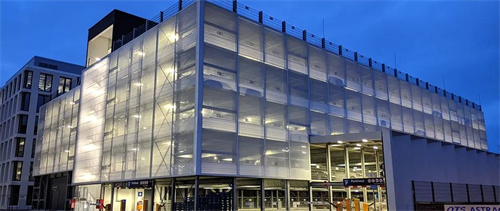 在德國不來梅的一個有蓋停車場立面,擁有近1,200平方米的ETFE。為避免被汽車大燈分散注意力,ETFE薄膜在下部區(qū)域采用白色涂料,在較高區(qū)域的薄膜采用白色印點(diǎn)設(shè)計。