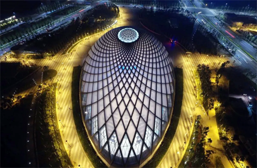 其復(fù)雜優(yōu)美的網(wǎng)格形式在國內(nèi)大跨度鋼結(jié)構(gòu)領(lǐng)域?qū)儆谑讋?chuàng),同時(shí),將支座設(shè)計(jì)成雙球鉸鋼支座,也是國內(nèi)網(wǎng)殼結(jié)構(gòu)的首例。