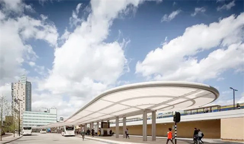 這個(gè)像云朵一樣的公交候車亭使用的是“氣枕式單室膜氣枕”。“浮動(dòng)”遮陽結(jié)構(gòu)占地超過1000平方米,由鋼框架支撐。由合成材料ETFE制成的充氣膜氣枕形成了不規(guī)則的鋼索網(wǎng)格。