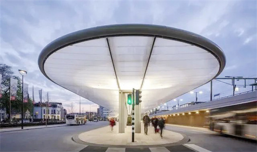 耐用、輕便且耐候的材料使設(shè)計(jì)師能夠?qū)⒔Y(jié)構(gòu)塑造成引人注目的球形。建筑師選擇在中間打開結(jié)構(gòu)以提供額外的日光,創(chuàng)造一個(gè)令人愉悅的環(huán)境,旅客可以在等待公共汽車時(shí)聚集在一起交談。