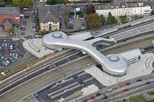 兩個(gè)位于鐵路兩側(cè)的圓頂建筑通過橫跨鐵路的天橋連接起來,材料是ETFE和鋁飄帶。螺旋狀的通道將乘客引入其中。設(shè)計(jì)通過忽略場地的方式對周圍環(huán)境和建筑做出回應(yīng)。其圓潤的形體模糊了屋頂和墻面、橋梁與建筑的范圍,乘客將在這里感受到一種獨(dú)特的異構(gòu)空間。