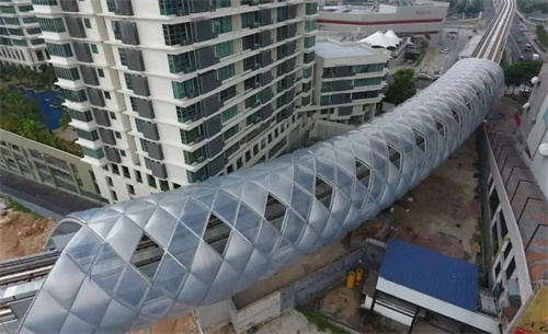 Kelana Jaya LRT Line Tunnel被譽(yù)為吉隆坡第一條“空中隧道”,于2016年3月開通,由ETFE氣枕包覆到扭曲的鋼結(jié)構(gòu)格子構(gòu)成,2500平方米的ETFE氣枕,由建筑師設(shè)計(jì)以創(chuàng)造一個(gè)“破碎”的表面,氣枕是透明,并印有厚重的銀色印刷,以在整個(gè)覆層上產(chǎn)生圖案。