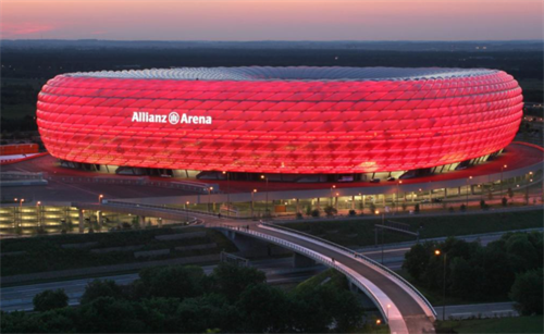 安聯(lián)球場外墻體由2874個氣墊構(gòu)成,其中1056個在比賽中可以發(fā)光。它外立面使用ETFE氣枕,內(nèi)嵌發(fā)光系統(tǒng),可使外墻分別發(fā)出紅光(當(dāng)球場作為拜仁慕尼黑隊的主場時)、藍(lán)光(當(dāng)球場作為慕尼黑1860隊的主場時)或白光(德國國家隊隊服的顏色)。