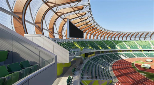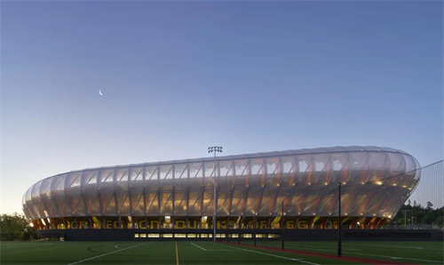 翻新后的俄勒岡大學(xué)田徑場,是世界上最具創(chuàng)新性的田徑場之一。圍墻使用了鋼結(jié)構(gòu)+木結(jié)構(gòu),并在外層包覆ETFE薄膜。木頭的重要性可以追溯到1974年,它旨在展示俄勒岡州的歷史和文化,突出林產(chǎn)品。