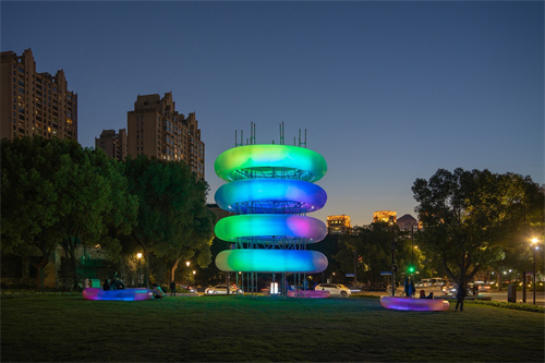 四層環(huán)形磨砂氣膜結(jié)構(gòu)圍繞核心柱向上疊加,形成視覺(jué)上彈性十足的“電容器”。大星吉子設(shè)計(jì)工作室從電磁波譜中汲取橙、黃、紫、綠四色,賦予其跳躍的色彩。84根LED戶外防水燈管設(shè)置于與氣膜環(huán)平行的鋼架上,每層環(huán)對(duì)應(yīng)3層燈管,形成全色域編程燈光矩陣。日間,裝置呈現(xiàn)出線條流暢的圓潤(rùn)質(zhì)感;而當(dāng)夜幕漸垂、華燈初上,裝置隨之點(diǎn)亮,色彩變幻的光線自半透明的氣膜浸潤(rùn)而出,以緩慢的節(jié)律呼吸,籠罩夜晚的草地。