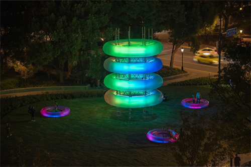 主裝置的設(shè)計(jì)靈感源自20世紀(jì)30年代為粒子加速器提供高直流電壓的考克饒夫特-瓦爾頓發(fā)電機(jī)(Cockcroft-Waltongenerator),大星吉子設(shè)計(jì)工作室期望通過(guò)設(shè)計(jì)傳達(dá)這種向上的力量感,同時(shí)給予其充分的交互性,讓積極的跳躍行動(dòng)去賦予城市空間能量。