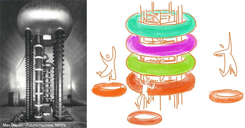 ▲左:主裝置設(shè)計(jì)靈感來(lái)源,右:主裝置設(shè)計(jì)手繪稿