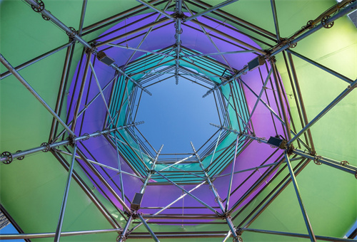 光塔的中心結(jié)構(gòu)由銀色不銹鋼管構(gòu)筑,經(jīng)過(guò)多輪設(shè)計(jì)推敲后,形成雙層嵌套式的中空七邊形結(jié)構(gòu),內(nèi)外層間距約30厘米,產(chǎn)生穩(wěn)定的拉力。大星吉子設(shè)計(jì)工作室特別選用了盤扣式不銹鋼腳手架,其圓盤型的節(jié)點(diǎn)適應(yīng)多方位的連接,并與裝置整體形態(tài)呼應(yīng);鋼架底端埋入深約1米的預(yù)設(shè)地基中,以確保結(jié)構(gòu)穩(wěn)固和水平。整體結(jié)構(gòu)簡(jiǎn)潔而精巧,使觀眾在裝置內(nèi)部仰視這座光影變幻的高塔時(shí),視線亦能通透無(wú)遮擋地望向天空。