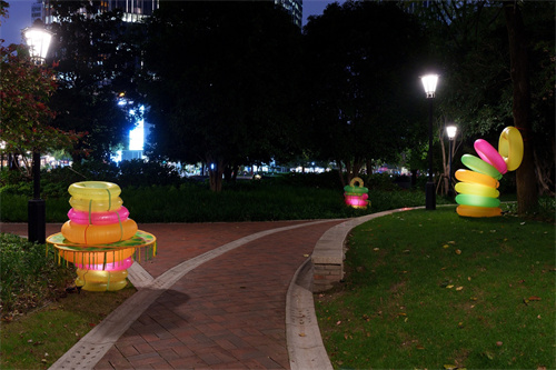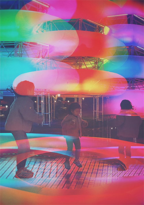 以大型交互燈光藝術(shù)裝置“JUMP城市電場(chǎng)”為引擎,插件作品“JUMP電仔”散落在公園串聯(lián)路徑,與市民共創(chuàng)的“情緒電仔”則呈現(xiàn)在新天地核心商業(yè)區(qū)域。作品的空間節(jié)奏動(dòng)靜有致,用一種游戲化的策略鼓勵(lì)觀眾的探索和參與?!半妶?chǎng)”所產(chǎn)生的“電能”作為驅(qū)動(dòng)故事線,營(yíng)造出作品在城市空間中不斷“跳躍”的生動(dòng)形象,激活并賦予公共空間新的含義。